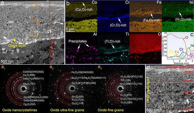 近日k8凯发国际官方入口◈◈◈,中国科学院兰州化学物理研究所润滑材料全国重点实验室高温摩擦学课题组与香港城市大学机械工程系先进结构材料课题组◈◈◈,在长期合作基础上提出了一种基于晶体-非晶异质结构与梯度纳米氧化层协同调控的高熵纳米复合材料设计策略◈◈◈。团队设计制备了一种Co25Ni23Cr20Fe20Ti6Al4B2高熵纳米复合材料重生之明星狩猎者◈◈◈,包含高密度Ti–O富集非晶纳米析出相的多级异质结构◈◈◈。在1000 ℃和较高接触应力条件下◈◈◈,该材料表面原位生成微米级厚度的梯度纳米釉质层◈◈◈,其晶粒尺寸沿深度方向从表面25nm渐增至基体112nmk8凯发国际官方入口◈◈◈,实现了应变逐层协调与应力有效缓解◈◈◈。得益于这一结构演化◈◈◈,该材料在1000 °C实验中获得了-2.3×10-6mm3/Nm的稳定负磨损率与0.26的低摩擦系数k8凯发国际官方入口◈◈◈,刷新了金属基抗磨材料的高温性能纪录◈◈◈。